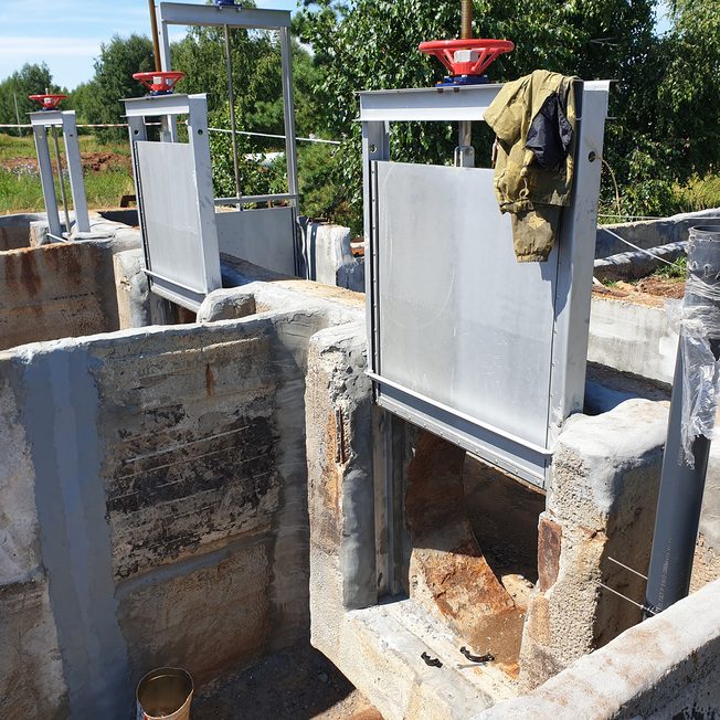 Конструкция выдерживает напор до 6 м по лицевой стороне (более — по ТЗ), работает в условиях загрязнённой воды, ила и мусора. Применяется на водозаборах, насосных станциях, КНС, очистных сооружениях и ГТС любого масштаба.